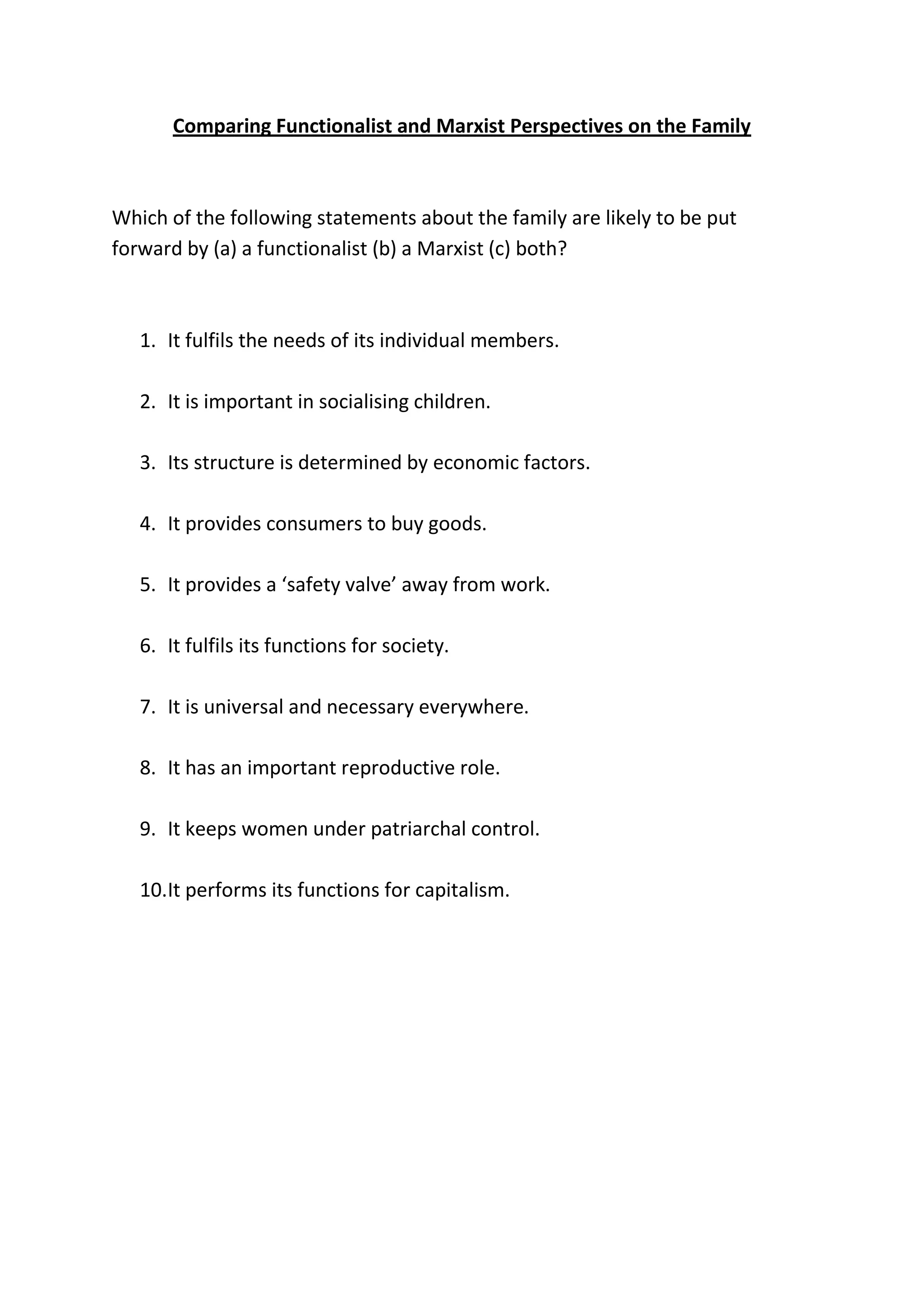 A functionalist perspective views the family as fulfilling important functions for society such as socializing children and meeting the needs of its members. A Marxist perspective sees the family's structure as determined by economic factors and serving the needs of capitalism by providing consumers and reproductive and patriarchal roles. Both perspectives would agree that the family socializes children and fulfills functions for society.