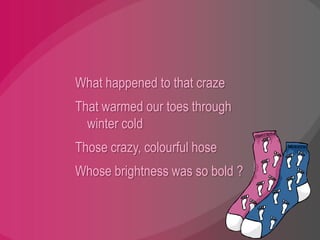 This poem expresses nostalgia for the trend of colorful, patterned socks that was popular in the past but seems to have disappeared. It describes the variety of sock designs once available, from bright colors and tartan patterns to lace trim, and laments that sock choices now seem scarce. The poem fondly recalls the fun of wearing outrageous socks and the challenge of removing the long socks from boots.