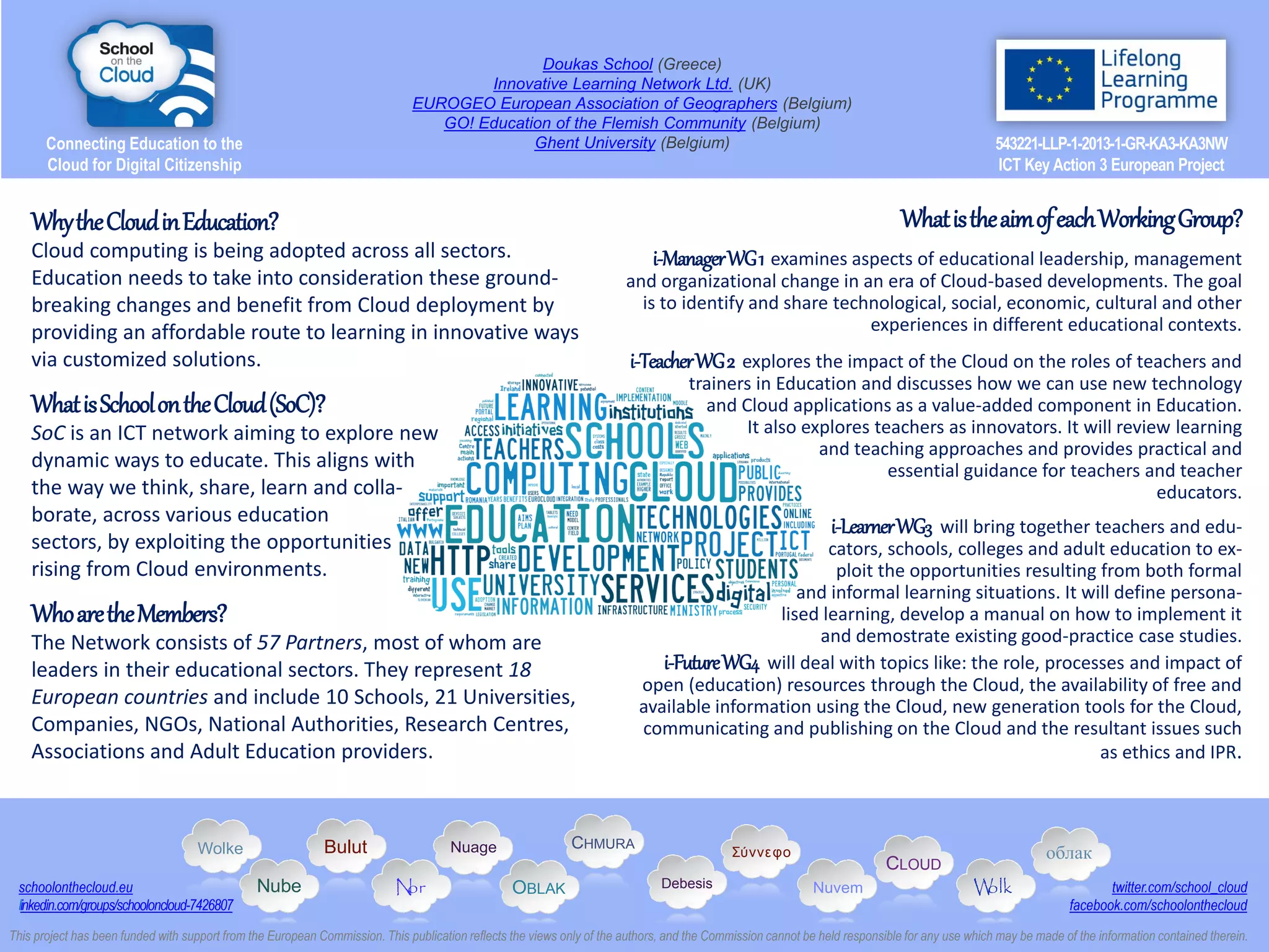 The document outlines the 'School on the Cloud' (SOC) project, which aims to connect education with cloud technologies to enhance digital citizenship among various stakeholders. It highlights the benefits of cloud education, such as real-time access, location independence, and cost reduction, while also exploring the future implications for educators and learners. The SOC network includes 57 partners from 18 European countries, focusing on frameworks to improve educational leadership, teacher roles, personalized learning, and open educational resources.