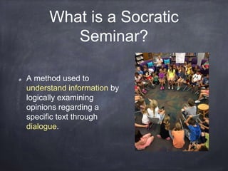 The document describes a Socratic seminar, which is a method for logically examining opinions about a text through dialogue. It involves an inner and outer circle of students. The inner circle leads the discussion by posing questions and building on each other's ideas, while the outer circle observes and provides feedback. Guidelines include coming prepared, referring to the text, taking turns speaking, and keeping the discussion focused on the text. The facilitator's role is to ask questions, challenge assumptions, and ensure the discussion remains collaborative rather than becoming a debate.