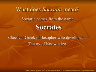 The document discusses Socratic seminars, which are structured discussions based on Socrates' method of questioning beliefs and pursuing truth. It describes how Socrates used dialectic to draw out knowledge from others through respectful questioning. A Socratic seminar involves a text, open-ended questions about the text, a leader to guide discussion, and participants who contribute their perspectives. The document outlines benefits like in-depth analysis and building collaboration skills, and reflects on students' experiences with their first Socratic seminar discussion.