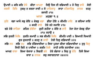 This document contains verses from various Sikh scriptures (Guru Granth Sahib Ji) that praise God and describe God's divine qualities and eternal nature. The verses discuss how God created the entire universe and sustains all beings. They state that those who meditate on God's name find peace and liberation from the cycle of rebirth. God is said to be the creator, the doer of all deeds, and cares for all. The document emphasizes devotion and remembrance of God at all times.