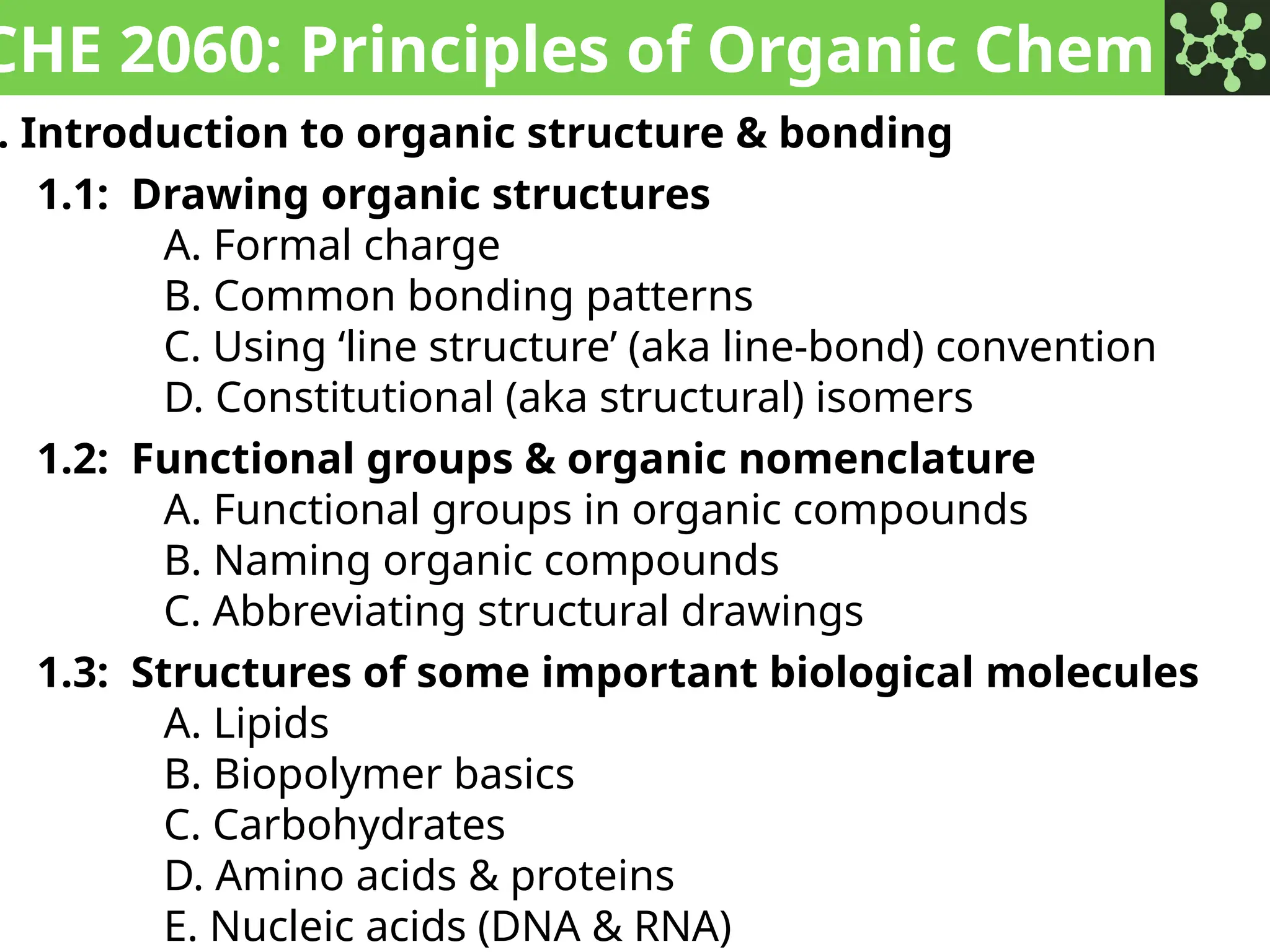 The document discusses the principles of organic chemistry, covering topics like organic structure, functional groups, and nomenclature. It emphasizes the importance of functional groups in determining chemical reactivity and explains the IUPAC naming conventions for various organic compounds, including alkanes, alkenes, and cyclic compounds. Additionally, it introduces methods for abbreviating complex molecular structures to facilitate communication in chemical discussions.