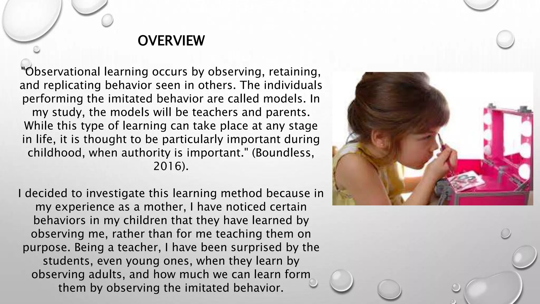 Observational learning occurs when individuals observe and imitate behaviors seen in others, especially during childhood. Teachers and parents act as models whose behaviors may be imitated. Observational learning involves attention, retention, reproduction, and motivation. Proper modeling of desired behaviors is important for positive results in children. Research shows infants as young as 10 weeks can imitate behaviors, demonstrating observational learning's role in early cognitive development and language acquisition.