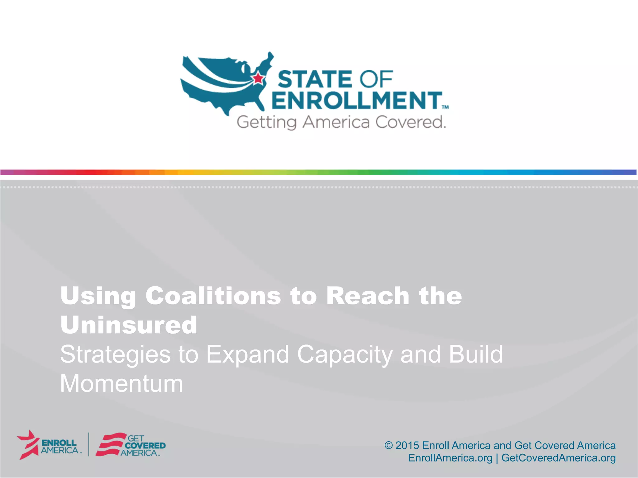 The document discusses strategies for using coalitions to reach the uninsured. It provides examples of successful statewide coalitions in Arizona and Alabama that use data analysis to target outreach in rural communities. It also describes a campaign in Nebraska called "500 and 1500 by the 15th" which brought assisters together and set enrollment goals to strengthen the coalition and gain positive media attention for the Affordable Care Act.