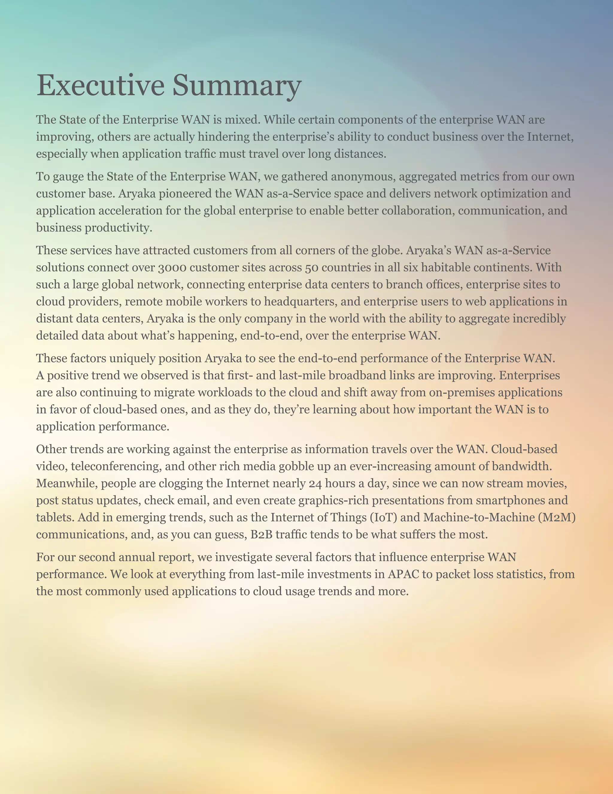 The document discusses trends in enterprise WAN performance based on aggregated metrics from Aryaka's global customer base. Some key findings include: