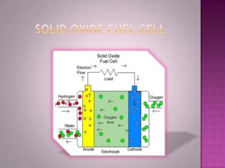 A solid oxide fuel cell (SOFC) works by using oxygen ions conducting through a solid ceramic electrolyte to generate electricity from hydrogen or other fuels. It consists of an anode and cathode separated by an electrolyte, and produces electricity through an electrochemical reaction without combustion. SOFCs operate at high temperatures between 1000-1800 degrees F, which allows them to use a wide variety of fuels. They are more efficient than traditional power generation and are being developed for applications such as stationary power plants, transportation, and residential use.