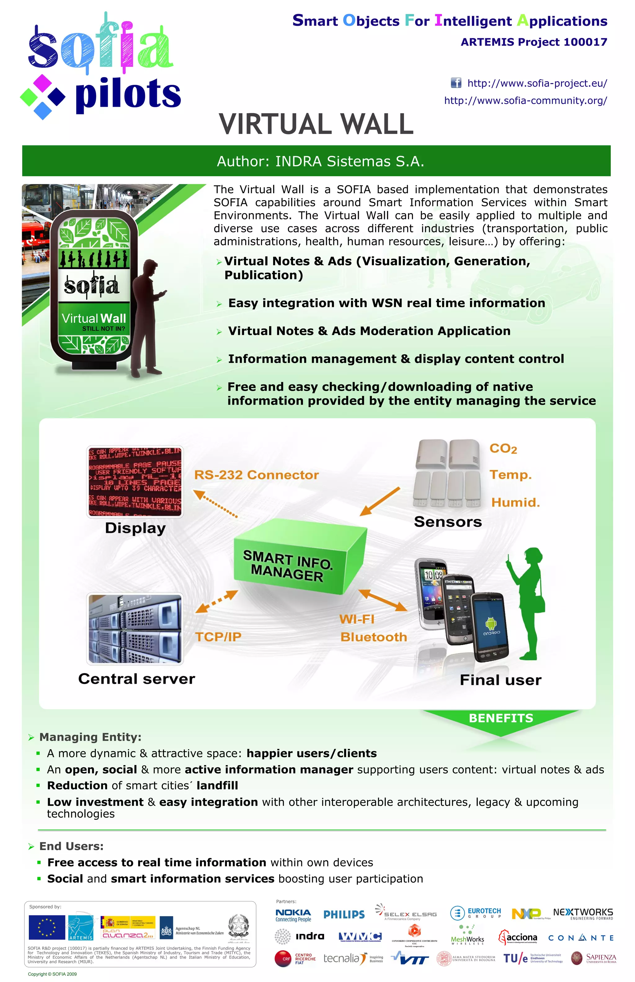 The document describes the Virtual Wall, a SOFIA-based implementation that demonstrates smart information services within smart environments. The Virtual Wall allows for visualization, generation, and publication of virtual notes and ads. It also enables easy integration with real-time information from wireless sensor networks. Benefits include a more dynamic space for managing entities and users, as well as free access to real-time information on users' devices. The Virtual Wall can be applied across industries like transportation, healthcare, and more.