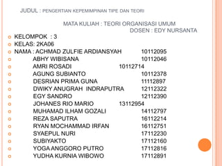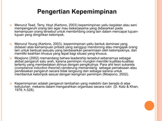 Dokumen ini membahas pengertian, fungsi, tipe, dan teori kepemimpinan, serta menyebutkan pandangan beberapa ahli mengenai kepemimpinan. Terdapat teori-teori yang mengkaji aspek genetik, sosial, dan situasional dalam kepemimpinan, menekankan bahwa pemimpin dapat dilahirkan maupun dibentuk. Kesimpulannya, efektivitas kepemimpinan bergantung pada situasi yang dihadapi dan keanekaragaman gaya kepemimpinan yang dapat diterapkan.