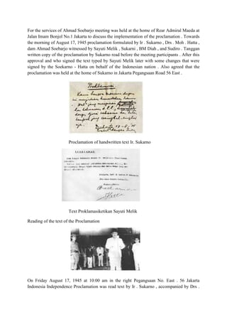 1) The proclamation of independence on August 17, 1945 in Jakarta.