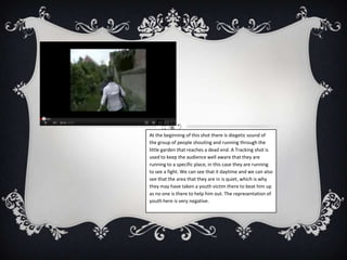This document provides a summary of shots from a short film about teenage bullying. It describes various shots that show a group of teenagers harassing and attacking other youths and a man. Their leader wears white and influences the others to cause trouble. Shots include the teenagers threatening a woman and laughing after attacking the man. At the end, the bullied boy's father is also attacked, so the boy comes outside and hits the leader of the gang with a cricket bat, causing the gang to run away scared. This restores a sense of peace and justice after the bullying depicted throughout the film.