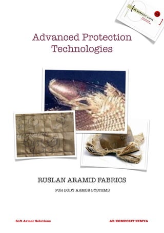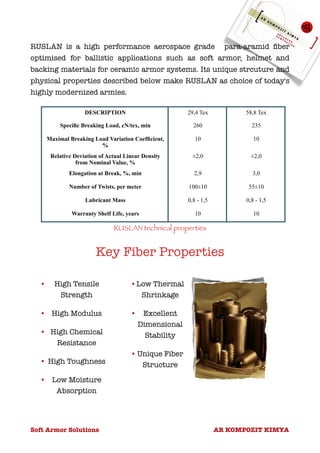 RUSLAN is a high performance para-aramid fiber optimized for ballistic body armor fabrics. AR Kompozit designed RUSLAN fiber and various ballistic fabrics using unique weaving techniques to provide lightweight and high performing body armor that meets international standards. The document describes RUSLAN fiber properties and various AR Kompozit ballistic fabric properties, weaves, weights and thicknesses that provide ballistic protection against various threat levels while maintaining flexibility and durability.