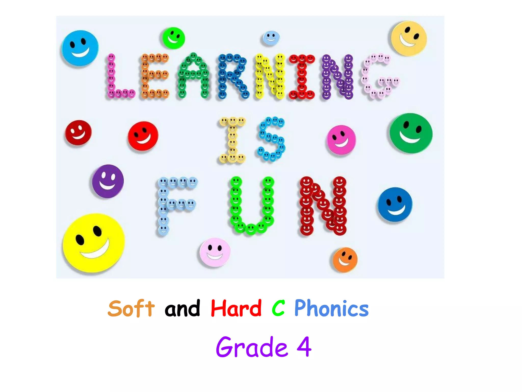 This document discusses the soft and hard sounds of the letter c in phonics. It notes that c usually makes a soft "s" sound when followed by the vowels e, i, or y. Examples of words with soft c are given such as "ice", "city", and "cycle". It also states that c typically has a hard "k" sound without being followed by e, i, or y, like in the word "cake". The document provides pictures of words to demonstrate the soft and hard c sounds.