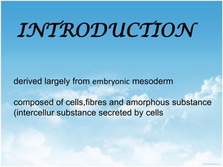 This document summarizes connective tissue pain and its causes. It discusses how connective tissue is composed of cells, fibers and intercellular substance that binds organs and tissues together. It must be strong. Connective tissue pain results from inflammation of these tissues and can be somatic, deep or musculoskeletal in nature. Cellulitis is provided as an example, which is an acute infection of loose connective tissues that causes swelling and pain. The document outlines treatments for connective tissue pain including antimicrobials, analgesics, anti-inflammatories, deep heat therapy, ice, massage and ultrasound.
