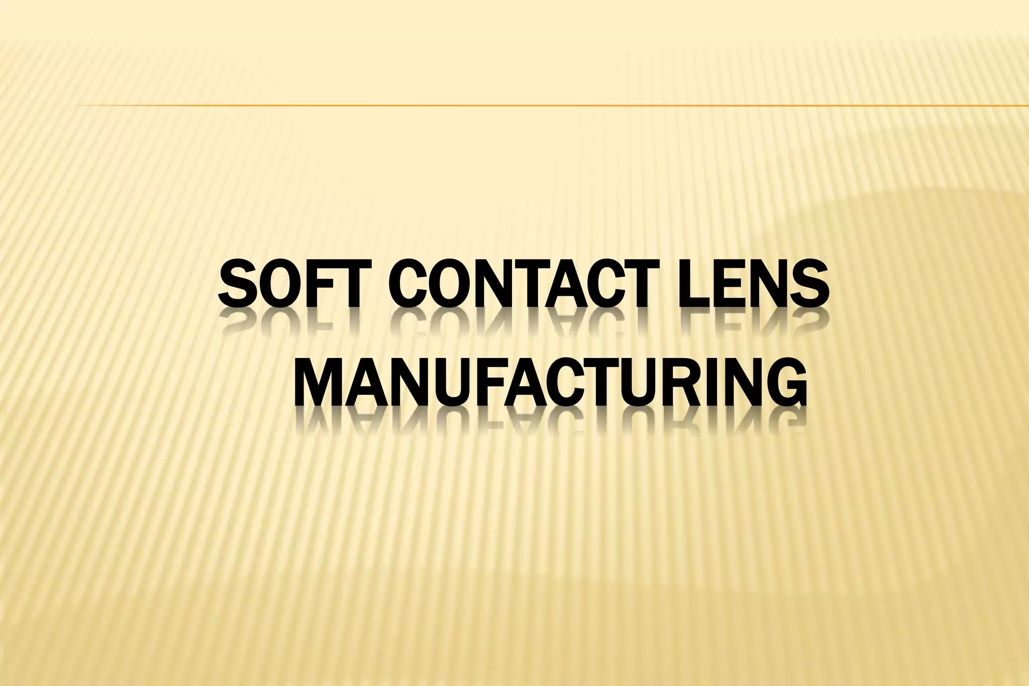This document discusses various methods for manufacturing soft contact lenses, including molding, spin-casting, and lathing. Molding involves polymerizing liquid monomers in a mold, while spin-casting uses centrifugal force to shape lenses as monomers polymerize on a spinning mold. Lathing starts with buttoning a lens blank and using tools to shape the lens surfaces. Combination methods are also discussed. Tinting methods include dissolving dyes into the monomers before polymerization or applying reactive dyes after lensing is complete.