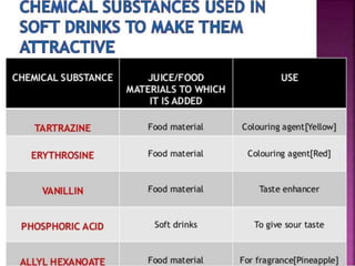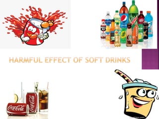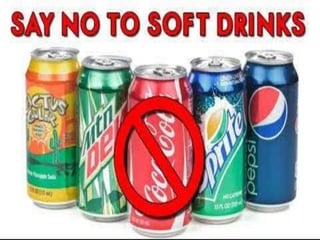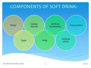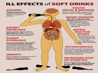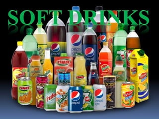 Soft drinks typically contain carbonated water, a sweetener like sugar or high-fructose corn syrup, and natural or artificial flavorings. They may also include caffeine, colorings, preservatives, and other ingredients. Stabilizers are added to prevent particles from settling. Common stabilizers include brominated vegetable oil, glyceryl ester of rosin, and sucrose acetate isobutyrate. Preservatives like sodium benzoate and potassium meta bisulphate are used to prevent spoilage. Regular consumption of soft drinks can lead to malnutrition, acidity, tooth decay, heart disease, obesity, kidney disease, and financial costs due to healthcare expenses.