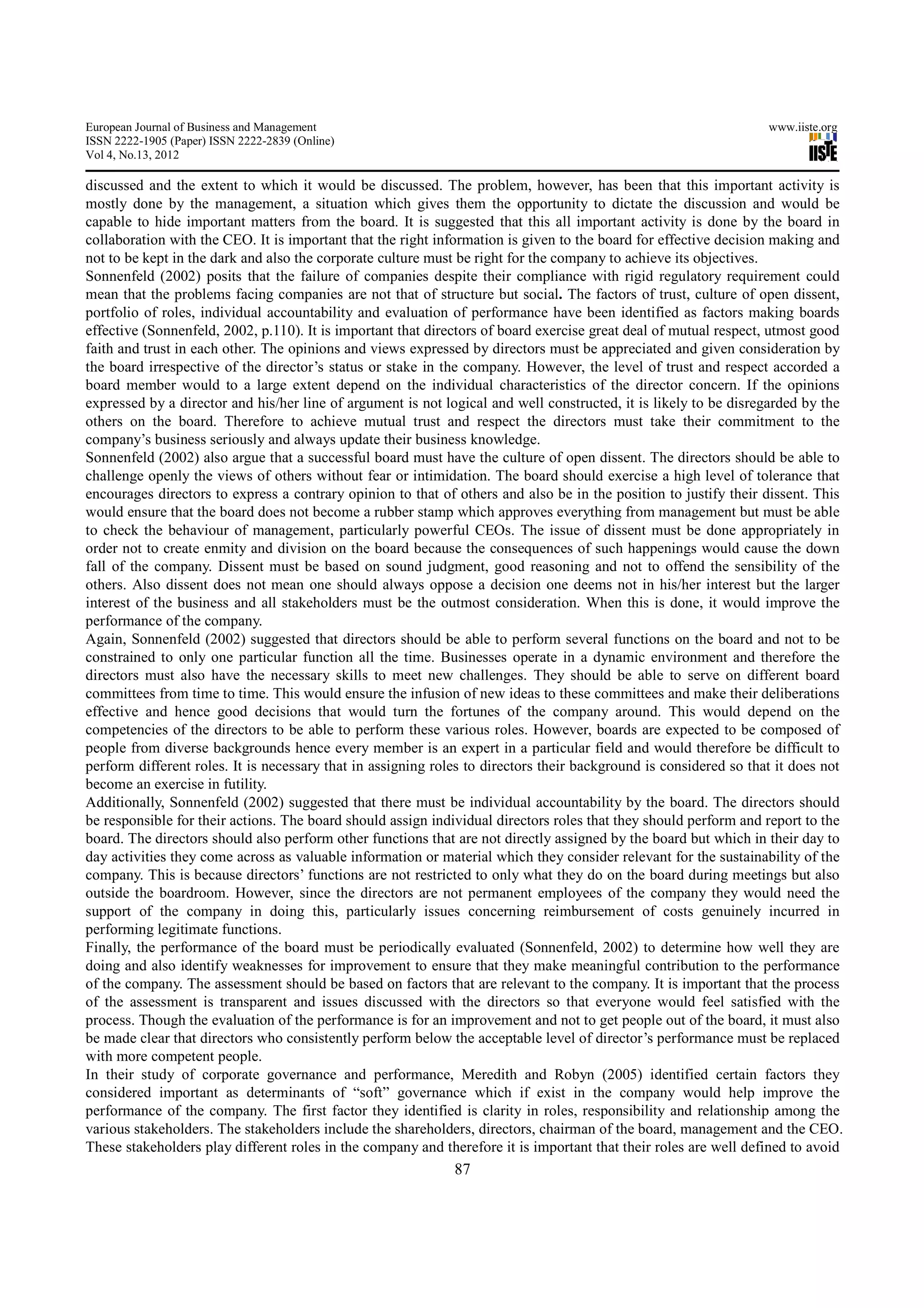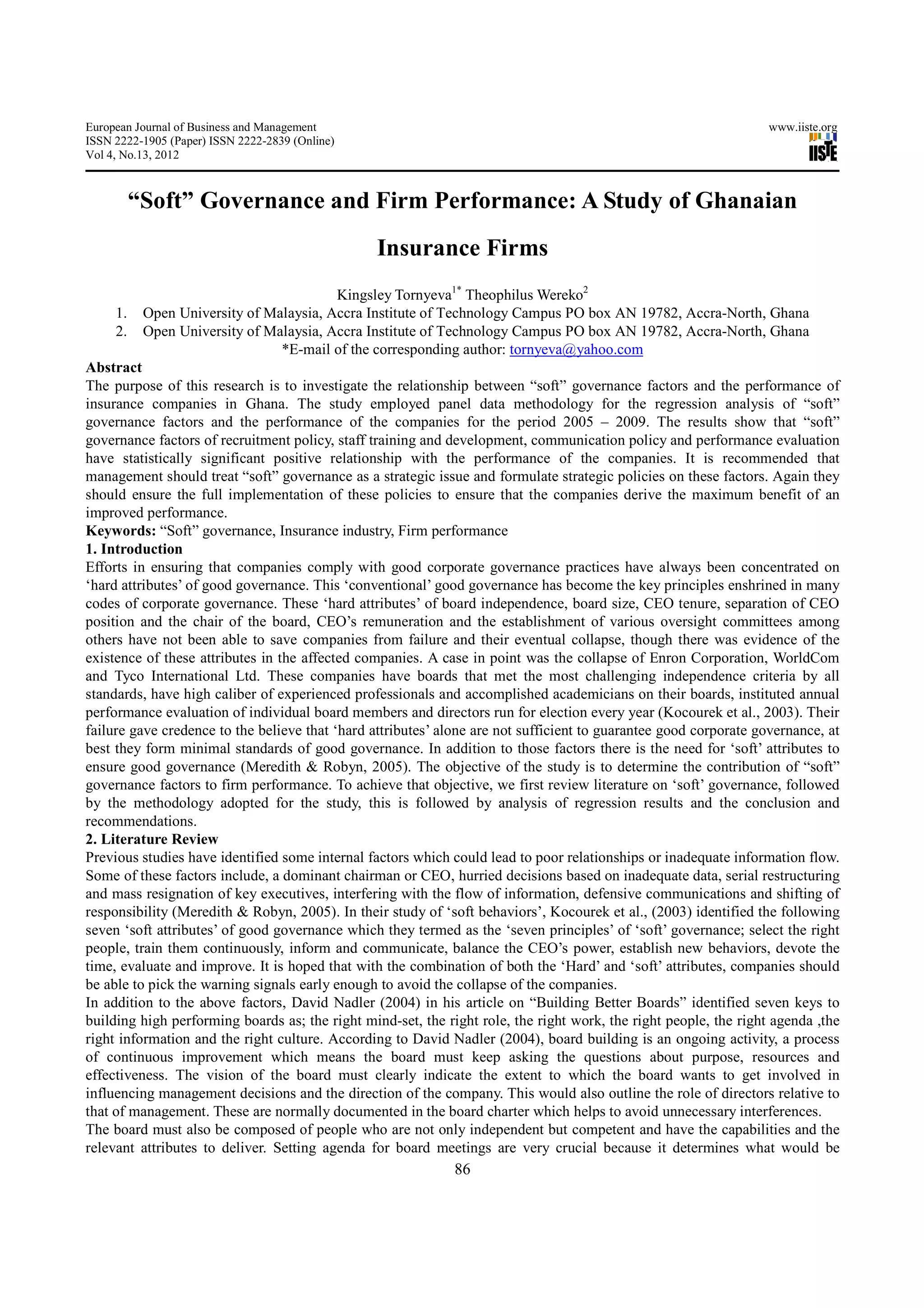 This document summarizes a study that investigated the relationship between "soft" governance factors and the performance of insurance companies in Ghana from 2005-2009. The study hypothesized that factors like recruitment policy, staff training, communication policy, and performance evaluation would have a positive relationship with firm performance. A questionnaire was used to collect data on these soft governance factors, while return on assets, return on equity, and corporate social responsibility were used to measure firm performance. Regression analysis found statistically significant positive relationships between the soft governance factors of recruitment policy, staff training, communication policy, and performance evaluation, and the performance of the insurance companies. The study recommends treating soft governance as a strategic issue and fully implementing related policies to maximize performance benefits.