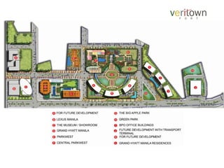 This document provides details about a new residential condominium project located in The Big Apple at Veritown Fort, Global City. It will be a 43-floor tower with 738 residential units of varying sizes from studios to 2-bedroom units with sky gardens. Construction is scheduled to begin in January 2015 with completion and turnover planned for December 2018. The project will include various amenities such as gardens, pools, and function rooms.