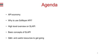 The Softlayer API allows users to automate tasks like managing servers and infrastructure. It has over 260 services, 3,183 methods, and 15,816 properties. Common tasks that can be automated include provisioning servers, managing object storage, and implementing messaging queues. The API uses a hierarchical structure of services and supports REST, SOAP, and XML-RPC. Useful resources for learning the Softlayer API include its documentation, code samples, and Python client libraries.