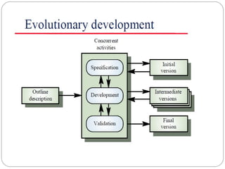 The document discusses several software development process models including waterfall, iterative development, prototyping, RAD, spiral, RUP, and agile processes. The waterfall model is a linear sequential process while iterative development allows for incremental improvements. Prototyping allows users to provide early feedback. RAD combines waterfall and prototyping and emphasizes rapid development. Spiral model iterates through risk analysis, development, and planning phases. RUP is object-oriented and divided into cycles. Agile processes emphasize working software, incremental delivery, flexibility, and customer involvement.