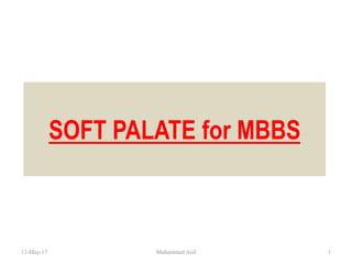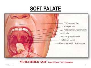 1) Anatomy as a mucous covered fibro-muscular curtain between the nasal and oral cavities with three regions;