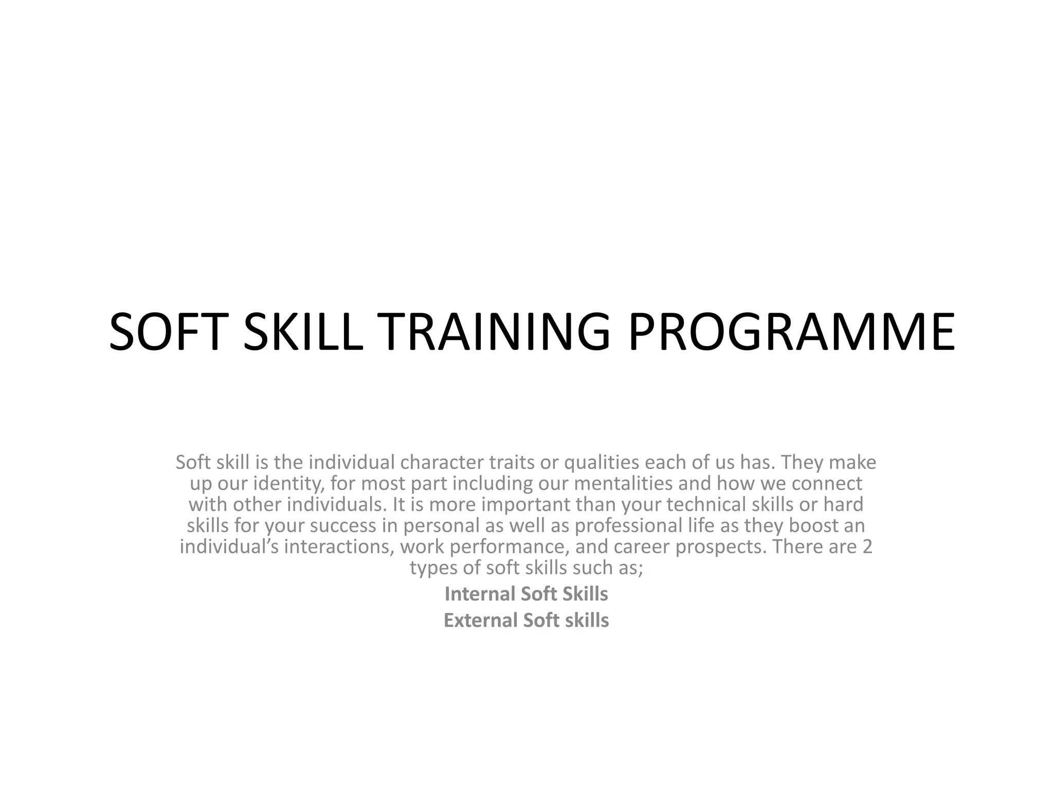 The document discusses the importance of soft skills, emphasizing their role in personal and professional success. It categorizes soft skills into internal (e.g., self-confidence, critical thinking) and external (e.g., teamwork, communication) and highlights their necessity for college students in preparing for the workforce. Additionally, it underscores the significance of mastering soft skills for effective decision-making, interpersonal relations, and overall career advancement.