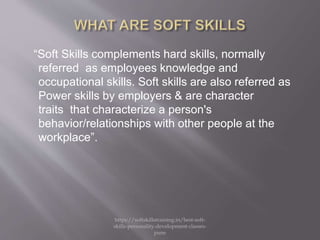 Soft skills complement technical skills and are character traits that characterize a person's behavior and relationships. They are highly valued by employers and referred to as "power skills." Developing soft skills gives individuals and their organizations competitive advantages like increased performance and productivity, better career growth opportunities, and higher pay. Examples of important soft skills include communication, problem solving, decision making, teamwork, and leadership.