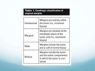 Soft tissue sarcoma is a rare group of tumors with a variety of subtypes, accounting for less than 1% of all cancers, predominantly affecting younger males and mainly located in the extremities. The document outlines the classification, diagnostic methods, treatment approaches, and prognostic factors related to soft tissue sarcomas, emphasizing the importance of accurate biopsy and surgical resection with the potential for adjuvant therapies. Additionally, it highlights that any mass over 5 cm should be treated as a soft tissue sarcoma unless otherwise proven.