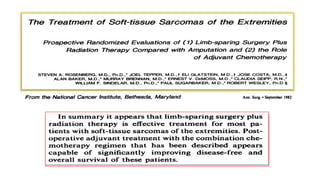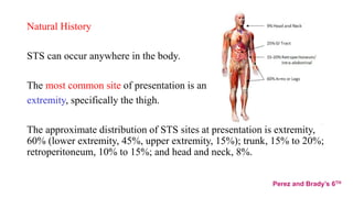 This document provides information on the management of soft tissue sarcoma. It discusses the clinical presentation, patterns of spread, imaging, histology, grading, staging, prognostic factors and management of soft tissue sarcomas. The key points are: