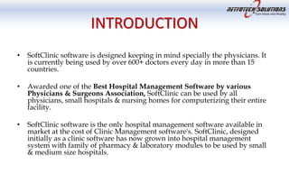 Softclinic software provides comprehensive hospital management solutions tailored for physicians, being utilized by over 600 doctors globally. It offers features such as quick prescription generation, patient record management, billing, and modules for various medical facilities, which enhance workflow and reduce operating costs. The software supports multi-language use and includes remote support services, with ongoing updates and customization options available for clients.