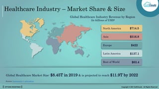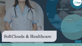 The document outlines the healthcare industry's market size and growth projections, highlighting a global healthcare market of $8.45 trillion in 2019 projected to reach $11.9 trillion by 2022. It details the digital transformation undertaken by Softclouds to improve operational efficiency, customer satisfaction, and cost management within a healthcare customer, resulting in significant time and cost reductions. Future trends in healthcare, including advanced technologies and personalized service, are also discussed alongside the company's strategic expertise and solutions.
