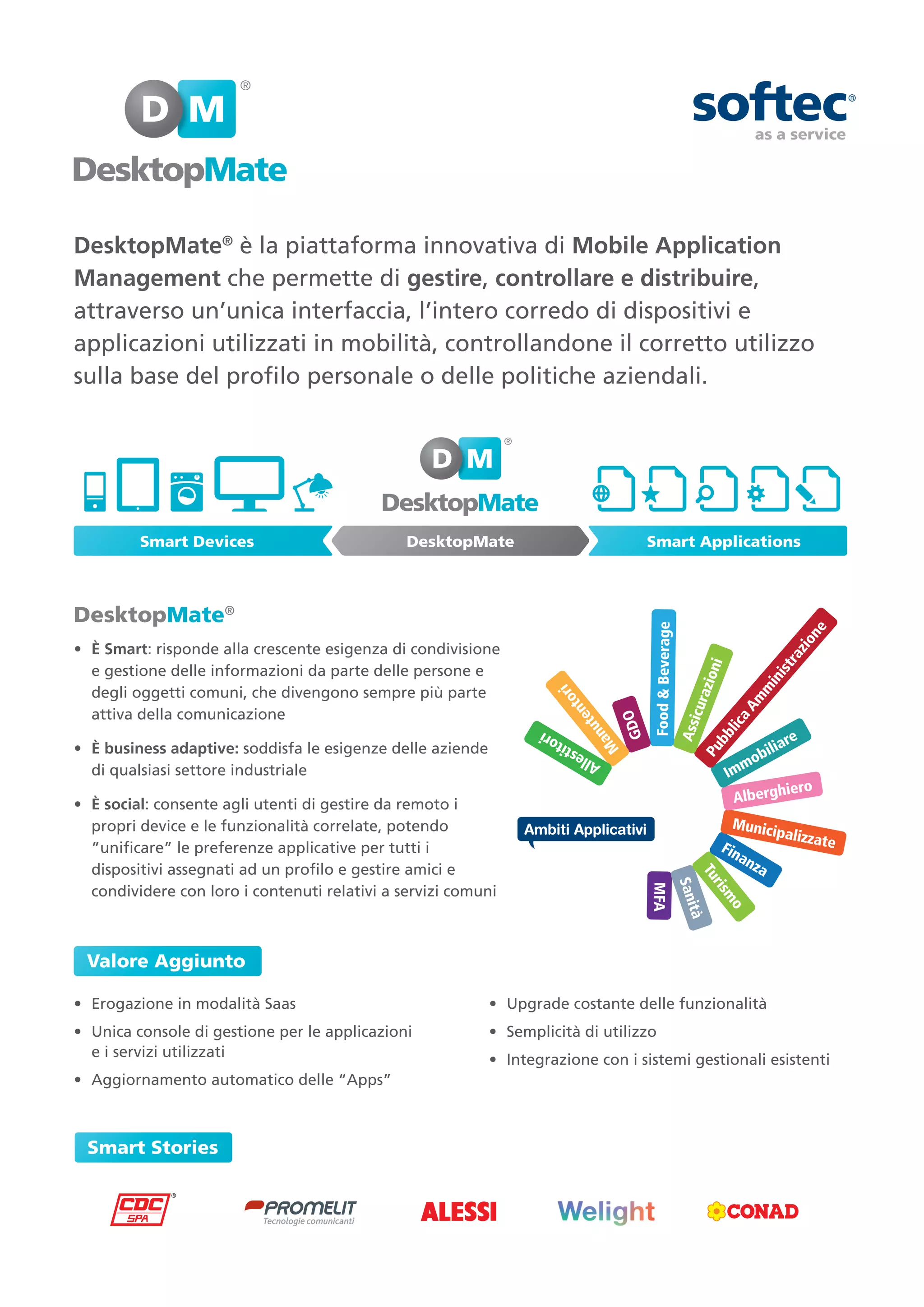 desktopmate® è una piattaforma di mobile application management che consente la gestione centralizzata di dispositivi e applicazioni attraverso un'unica interfaccia. Supporta l'integrazione dei servizi aziendali e della funzionalità remota per i dispositivi degli utenti, oltre a garantire l'aggiornamento automatico delle applicazioni. Ha un'architettura flessibile che permette anche l'interazione con dispositivi domestici e sistemi di sorveglianza.