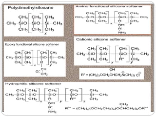 Softening finishes are important textile treatments that make fabrics feel softer. Chemical softeners allow fabrics to have a soft, smooth hand. The main types of softeners are cationic, anionic, non-ionic, and amphoteric softeners. Cationic softeners provide excellent softening but can cause yellowing, while anionic softeners have lower softening ability but better compatibility. Silicone softeners provide unique softness and properties like durability and heat stability, but can be expensive. Softener selection depends on the desired properties like fastness, compatibility with other chemicals, and effect on processes like seam slippage or drying.