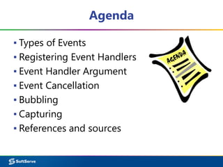 This document discusses JavaScript events. It covers types of events like onclick and onmouseover. It describes how to register event handlers by setting attributes or properties. It discusses the event handler argument and how to cancel events. It also explains event bubbling and capturing, where events triggered on nested elements will trigger from the innermost to outermost elements or vice versa.