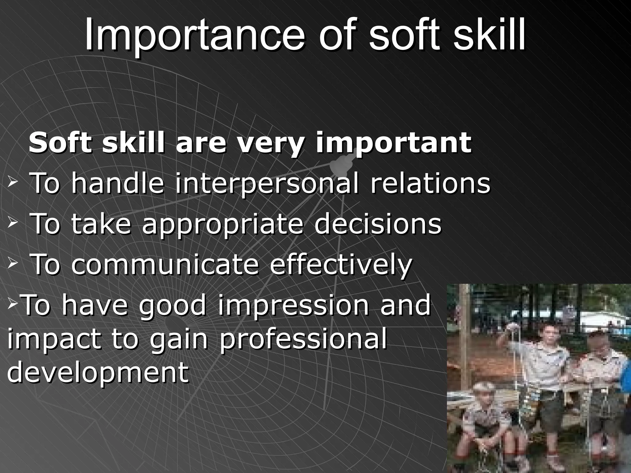 Soft skills are important for career success, especially in ITES. Key soft skills include communication skills, teamwork, presentation skills, interpersonal skills, time management, stress management, leadership skills, and professional ethics. Effective communication involves speaking clearly, using appropriate vocabulary, body language, and written communication skills like spelling and grammar. Presentation skills require planning, preparation, delivery, maintaining eye contact, speaking conversationally, and soliciting feedback.