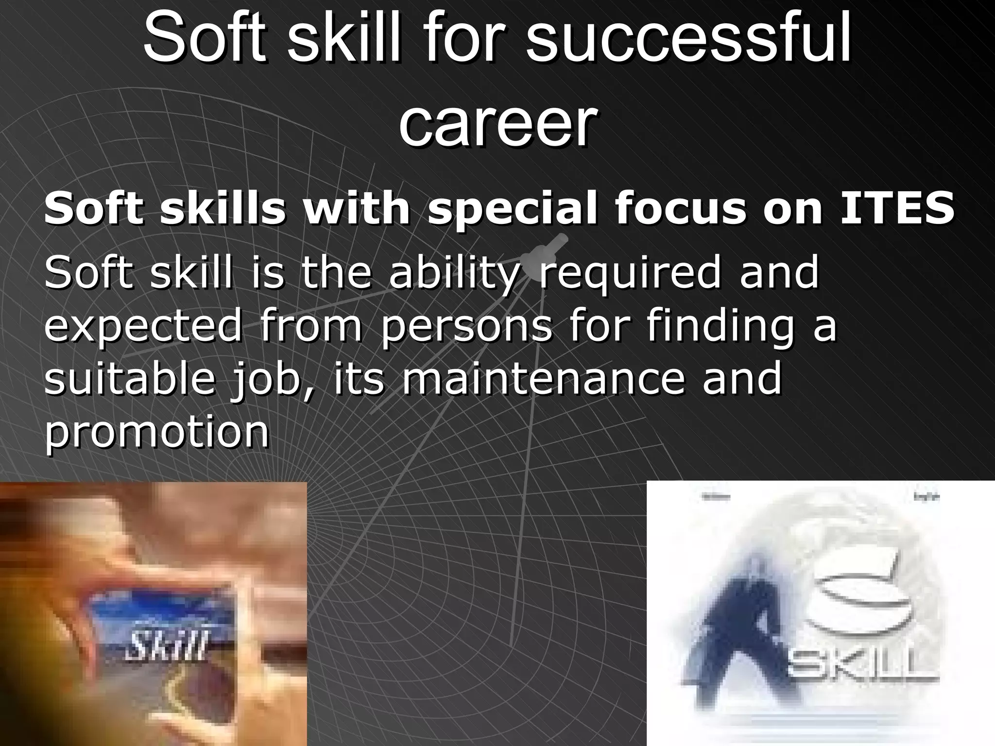Soft skills are important for career success, especially in ITES. Key soft skills include communication skills, teamwork, presentation skills, interpersonal skills, time management, stress management, leadership skills, and professional ethics. Effective communication involves speaking clearly, using appropriate vocabulary, body language, and written communication skills like spelling and grammar. Presentation skills require planning, preparation, delivery, maintaining eye contact, speaking conversationally, and soliciting feedback.