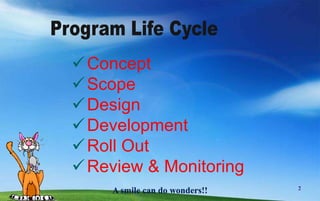 The document proposes a soft skills training program for students to enhance their employability. The program would include modules on managing self, communication skills, assertiveness, time management, and teamwork. It would be delivered over 4 days with 2 hour sessions. The objectives are to help students improve attitudes, decision making, leadership, communication, and career prospects. Effectiveness would be monitored through trainee feedback and periodic refresher sessions. The training aims to provide students with skills needed for personal and professional success.