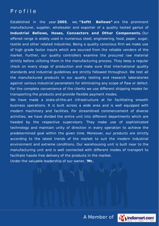 Softt Bellows, established in 2005 and based in Pune, is a manufacturer and exporter of a variety of industrial products including bellows, hoses, connectors, and flexible pipes. The company emphasizes quality control through rigorous testing and high-grade materials, servicing industries such as steel, engineering, and textiles. Their infrastructure supports efficient operations and flexible delivery options, ensuring adherence to modern industrial standards.