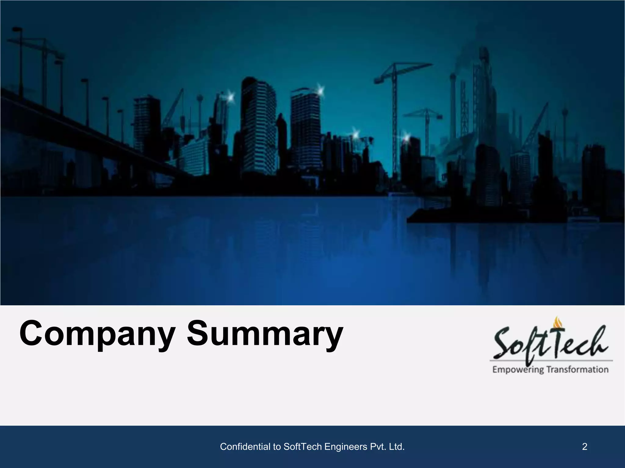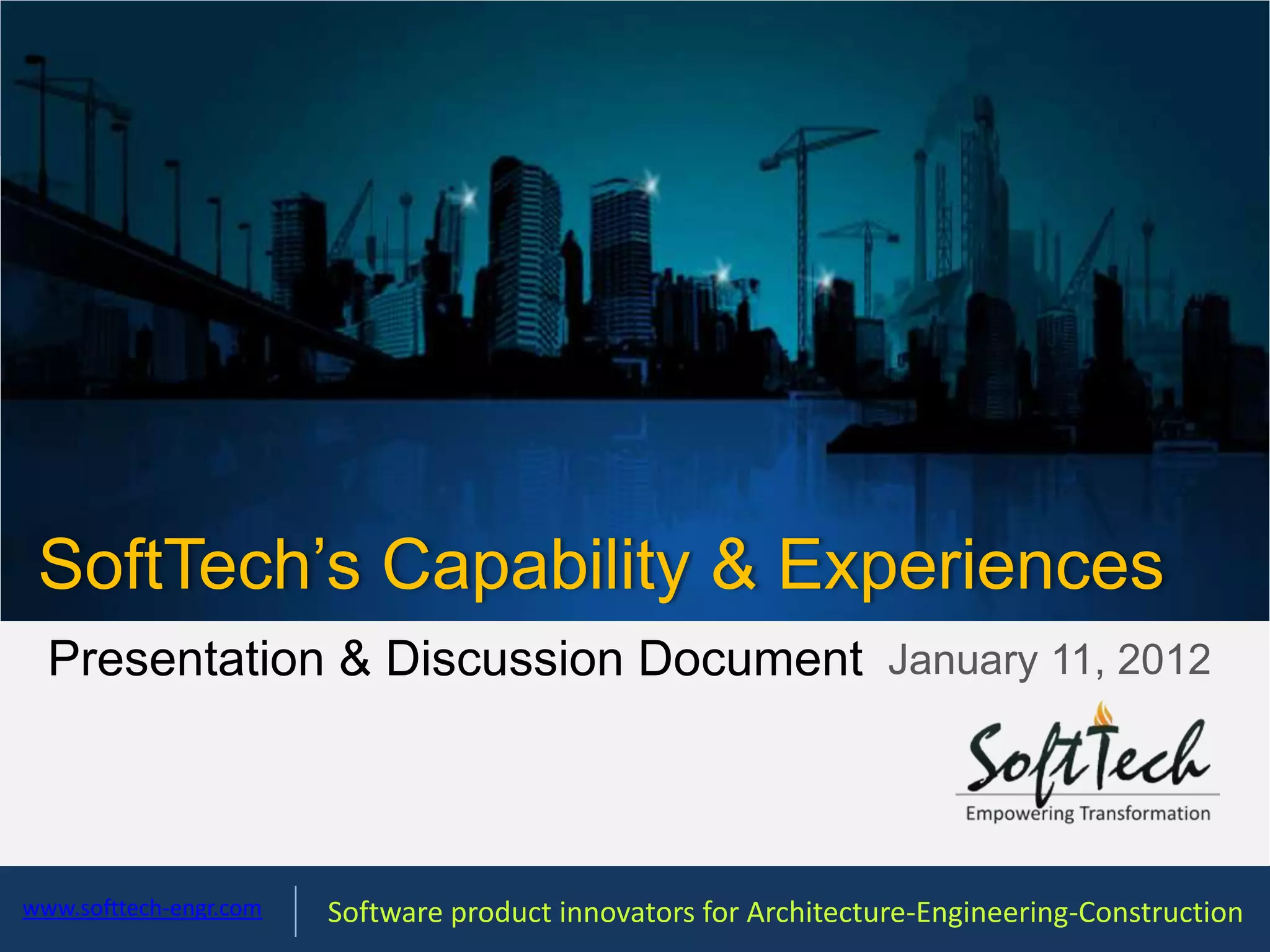 SoftTech is an ISO 9001:2008 accredited engineering software company headquartered in Pune, India. It offers innovative solutions for architecture, engineering, and construction organizations, including applications for building plan approval, public works management, design office management, and construction lifecycle management. SoftTech has alliances with industry leaders like IBM, Microsoft, and Autodesk to integrate their technologies. It has received several awards for its solutions and services.