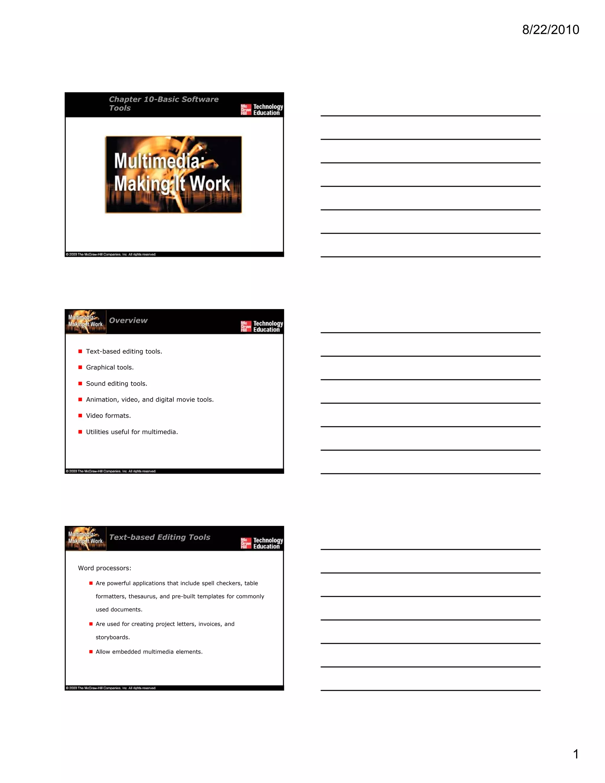 The document discusses various basic software tools for multimedia, including text editing tools like word processors, graphical tools like painting and drawing programs, sound editing tools, and tools for working with animation, video, and digital movies. It also covers common file formats for video like QuickTime and AVI. Utilities that can help with multimedia include screen grabbers and format converters.