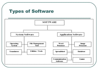 The document discusses different types of computer software. It describes system software, which controls hardware and enables application software. Application software supports specific tasks like word processing. The document focuses on operating systems as essential system software that manages computer operation. It discusses operating system techniques like multiprocessing, multitasking and multiprogramming. It also covers system software utilities that support file management, data compression, diagnostics and more.
