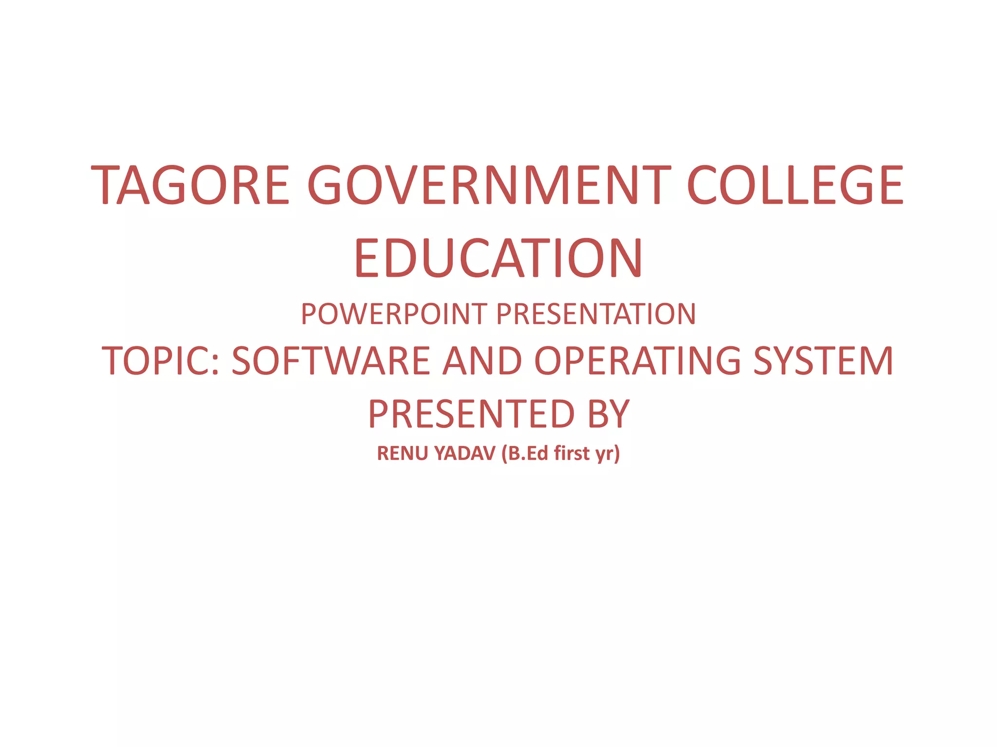 This document provides an overview of software and operating systems. It begins by defining computer software and classifying it into two main categories: system software and application software. System software manages computer hardware and provides a platform for running other software. Application software allows users to perform useful tasks. The document then focuses on operating systems, describing them as the most important system software. It explains the basic functions of operating systems, such as controlling hardware access and managing files, and classifies operating systems based on features like single-user vs multi-user capabilities.