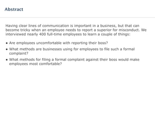 A survey of nearly 400 employees reveals discomfort in reporting managerial misconduct, with only 32% feeling 'very comfortable' filing a complaint. The primary reasons for hesitation include fear of retaliation, and a significant number of respondents were unsure about proper complaint channels. Furthermore, 75% indicated that comfort with the complaint process is crucial for their job satisfaction.