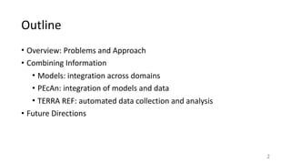 This document discusses using software and data as scaffolds for integrative science. It describes challenges in agriculture and scientific problems that require knowledge across many scales and formats. Computational solutions are proposed to combine expert knowledge, data, and mechanistic models through platforms like PEcAn and TERRA REF. PEcAn provides common formats and tools to link models and data. TERRA REF aims to create open reference datasets from automated phenotyping to enable interdisciplinary collaboration. Future directions include expanding software, data sharing, and training to support more scientists in data-driven research.