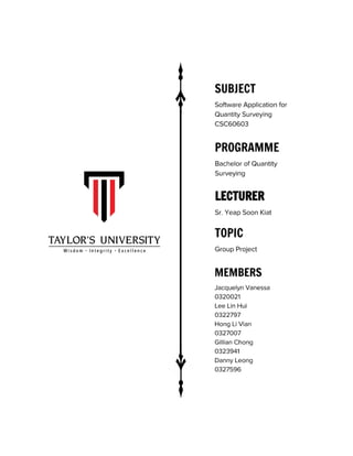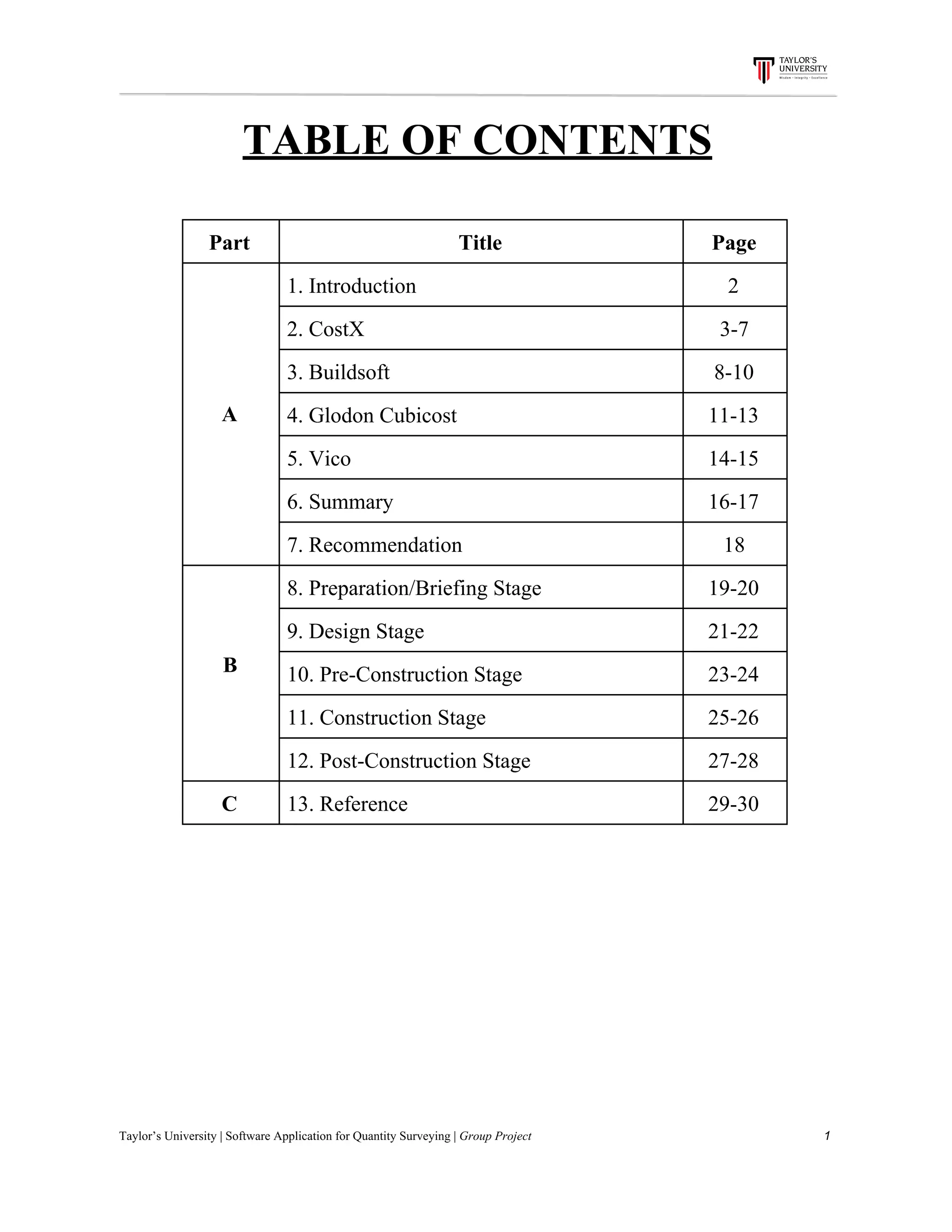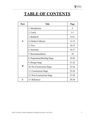 The document provides a table of contents for a report on software applications for quantity surveying. It outlines three main parts: introduction and overview of four software (CostX, Buildsoft, Glodon, Vico), features of CostX and Buildsoft, and a references section. CostX allows 2D and 3D measurement and modeling from various file types, automatic revisions, subcontractor comparisons and eco-friendly paperless reporting. Buildsoft (Cubit) enables 3D takeoffs, referencing, price lists, job analysis and automatic plan revisions for estimating.
