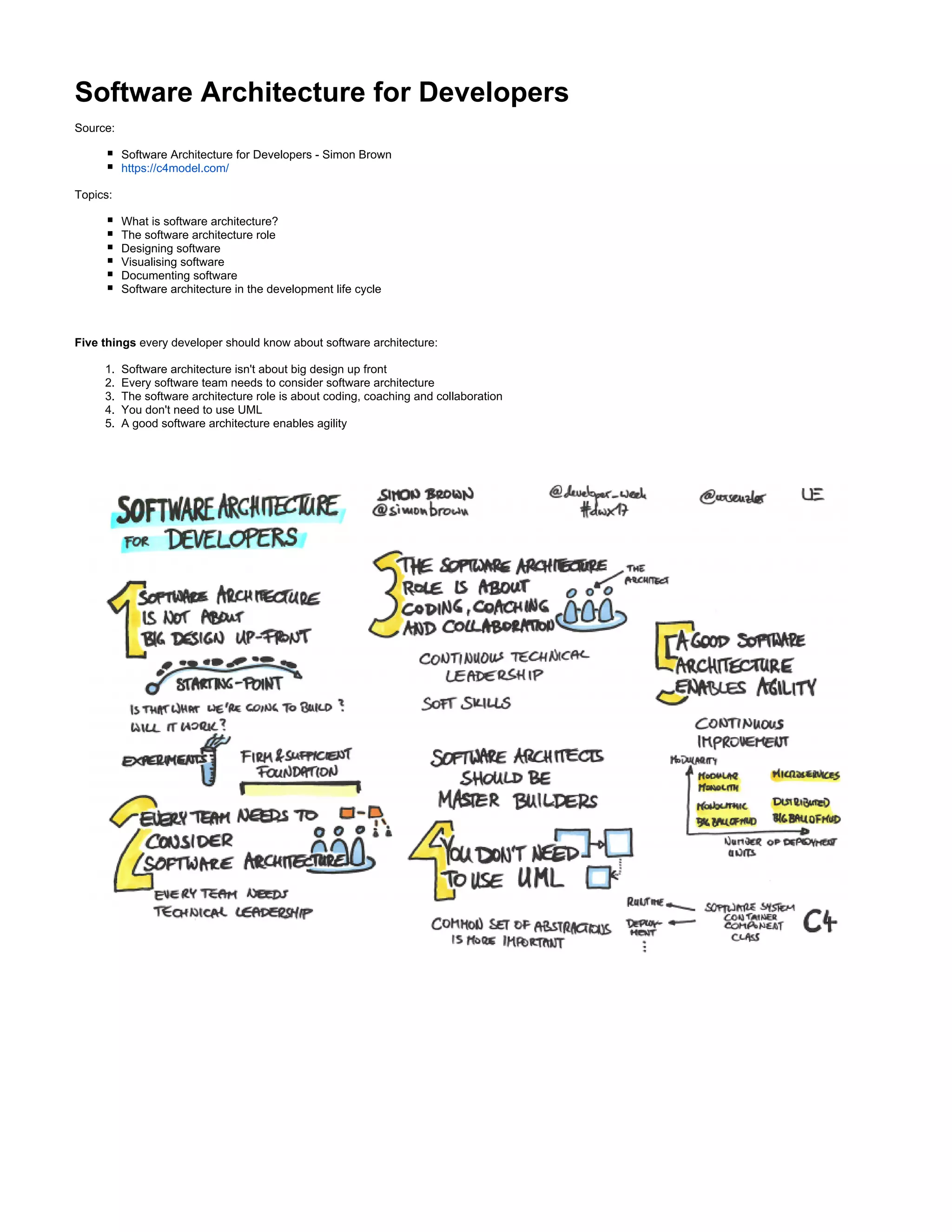 The document discusses software architecture for developers. It covers topics such as what software architecture is, the software architecture role, designing software through understanding requirements, quality attributes, and constraints. It also discusses visualizing software using sketches and diagrams, documenting software architecture, and provides several case studies and examples. The key points are that software architecture is important for avoiding chaos, a good architecture enables agility, and the software architecture role involves both technical and soft skills as well as coding, coaching and collaboration.
