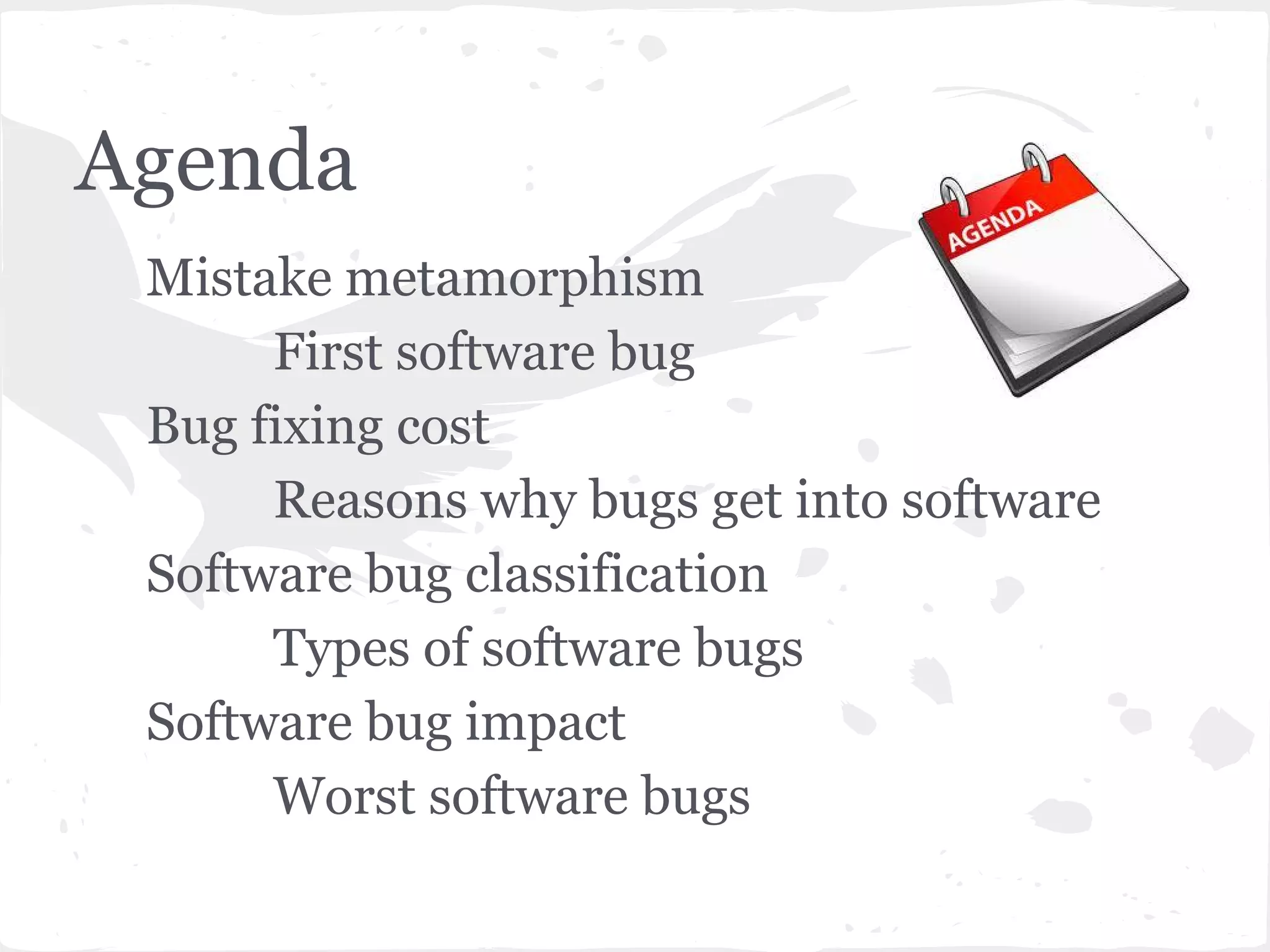 This document discusses software bugs including their history, causes, impact, and classification. It begins with definitions of common terms used to describe bugs and errors. Key events that resulted from software bugs like the Mariner 1 space probe failure and radiation therapy machine bugs that killed patients are summarized. The document also outlines common reasons why bugs are introduced during development including lack of testing and unrealistic timelines. It concludes with classifications of bugs and contact information for the author.