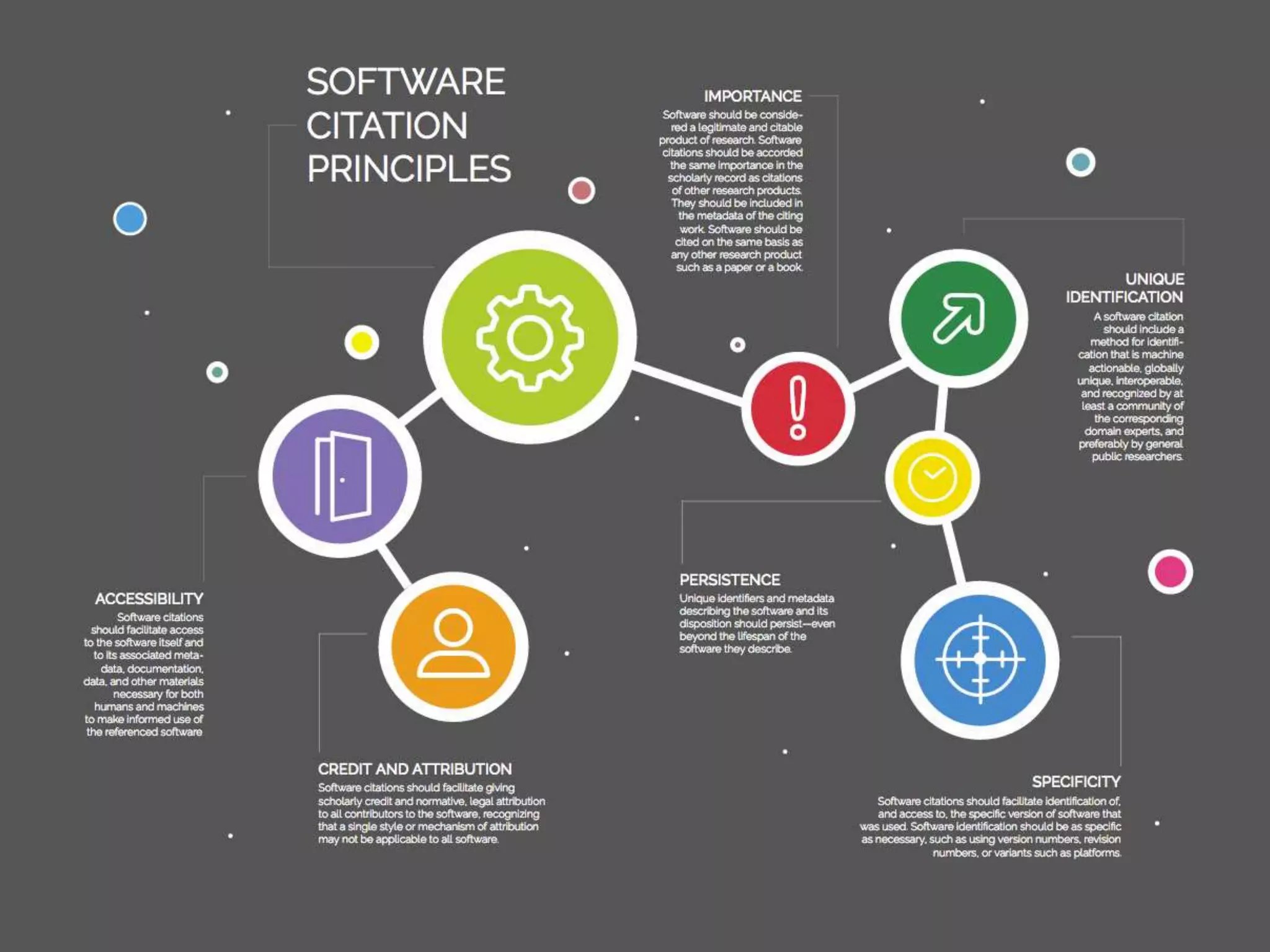 The document discusses software citation principles proposed by the FORCE11 Software Citation Working Group. It provides motivation for better recognizing software as a research output and measuring its impact and contributions through citation. The working group developed six software citation principles around importance, credit, unique identification, persistence, accessibility, and specificity. It also discusses implementing the principles through publishing software and citing other software in research papers, and next steps around endorsement and implementation efforts.