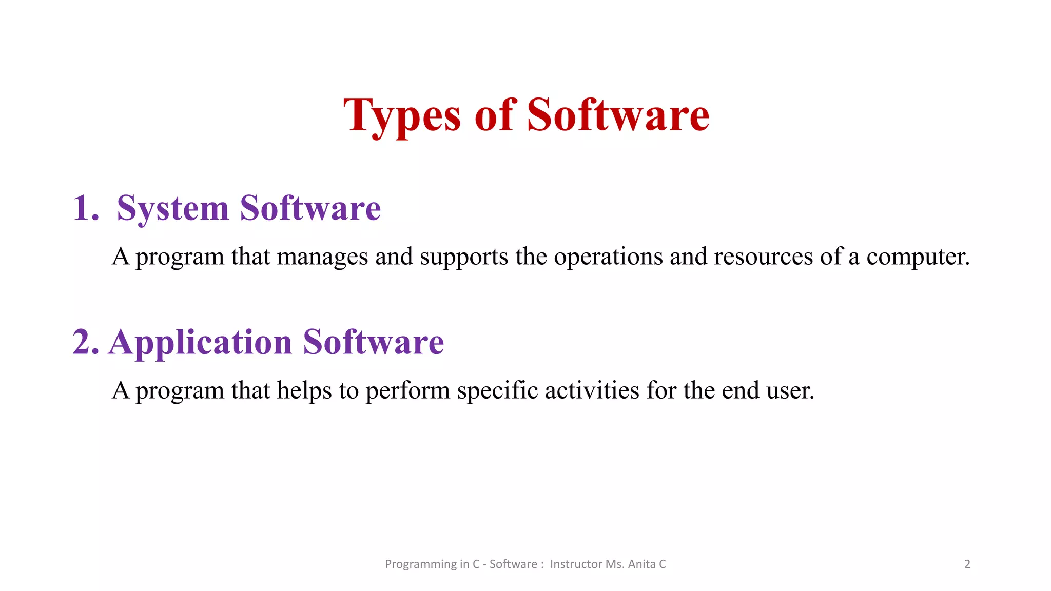 Software is a set of instructions that tell a computer how to perform tasks. There are two main types of software: system software and application software. System software manages computer resources and includes operating systems, while application software helps users perform tasks and includes programs like word processors and accounting programs. System software supports computer operations and is necessary for the computer to function, while application software performs specific user tasks.