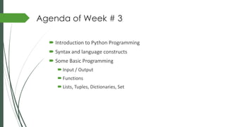 This document provides a comprehensive overview of Python programming, covering its introduction, syntax, and various data structures such as lists, tuples, dictionaries, and sets. It highlights Python's advantages over C and C++, outlines the steps of Python code execution, and explains core programming concepts like functions, conditional statements, and loops. Additionally, it details the unique properties of Python collections and provides code examples for practical understanding.